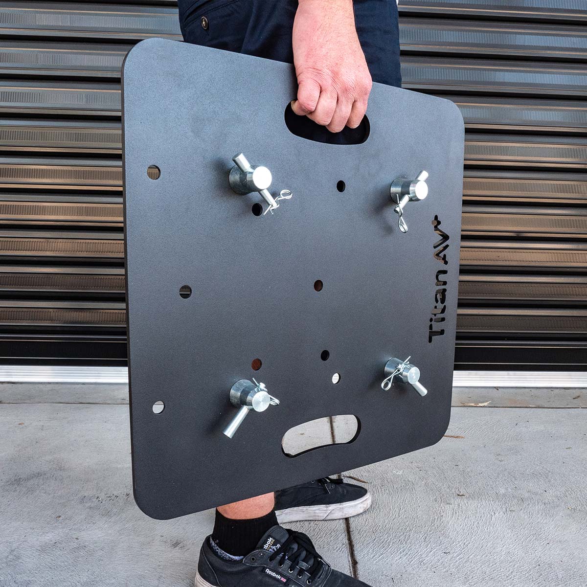 Titan AV truss base plates are hands down the best base plates available for lighting truss in the Australian Stage Production Industry. Laser cut 8mm steel plate covered in a hardwearing matt black powder coat with multiple positioning points located in the centre & centre side.
