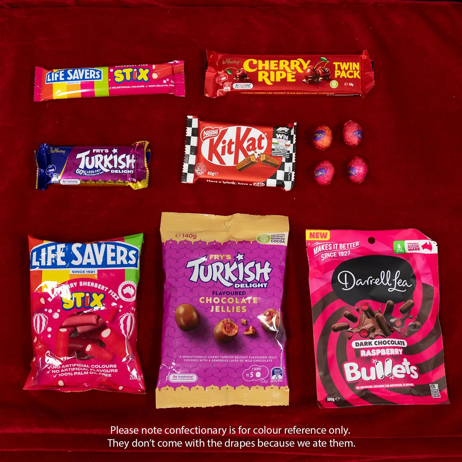 - 1x Burgundy Velvet Drape (3.15m x 3m drop, 300gsm)