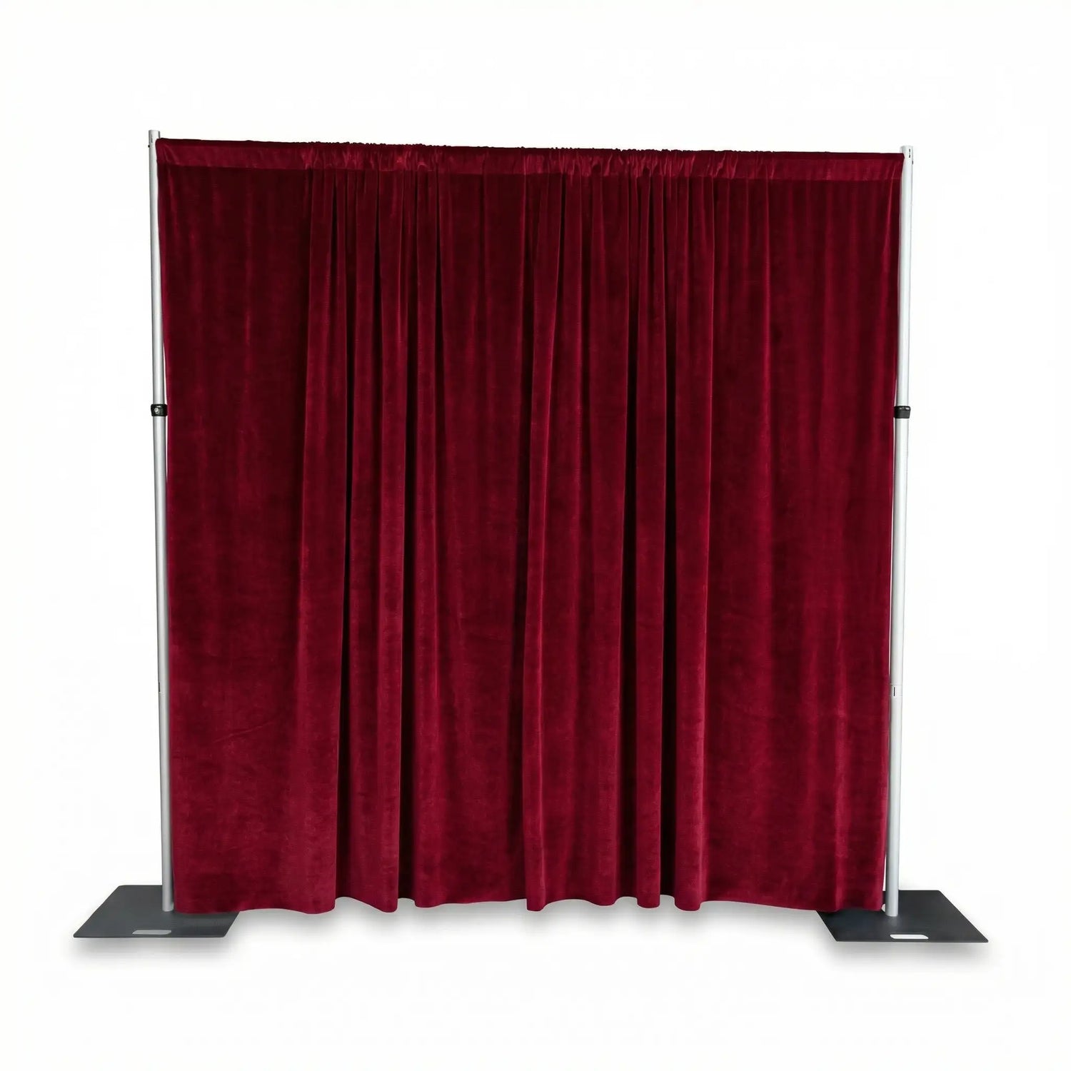 The included 300gsm burgundy velvet drape (3.15m across x 3m drop) delivers a high-quality, light-absorbing finish, perfect for hiding event infrastructure, creating partitions, or enhancing visual presentations. The steel base plates feature multiple mounting points, giving you the flexibility to position the upright poles where needed.