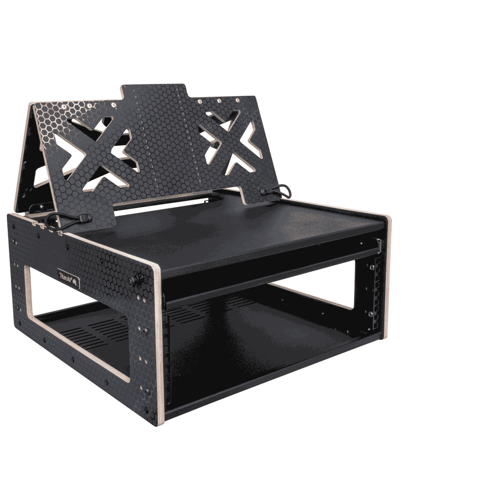 A fully assembled Titan AV 3RU Broadcast Flight Rack plus Sliding Shelf & Monitor Mount (compatible with Waves eMotion LV1, Midas MR18, Behringer XR16, QU-PAC, and Blackmagic rackmount equipment)