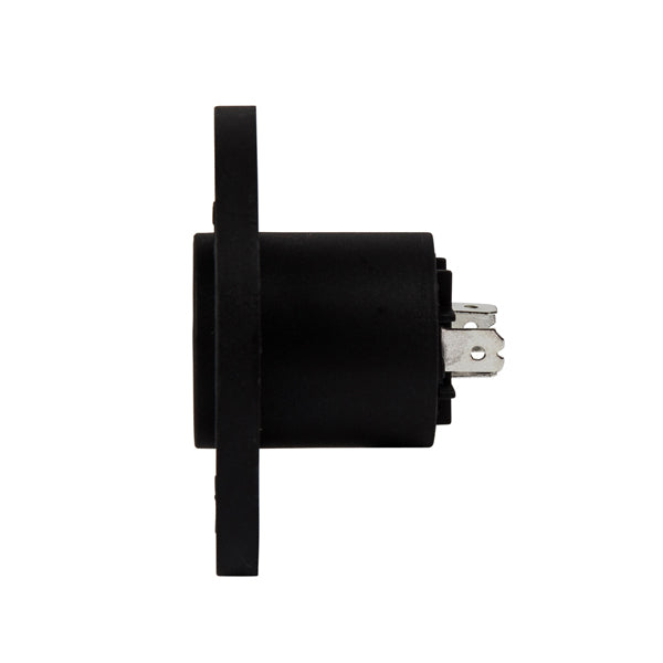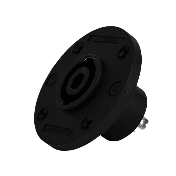 Speakon chassis mount sockets offer greater reliability, ease of assembly, improved contact integrity and air-tight design for speaker boxes. This is a high quality 4-pole round speakon socket with a robust ABS plastic chassis, metal locking in area and accurate twist lock latching system. Perfect for connections between power amplifiers, passive speakers, patch panels and speaker box builds, designed to transfer speaker line level signals.
