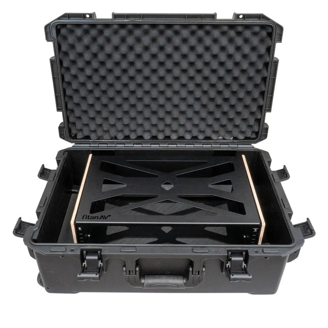 This bundle includes the 2RU Titan AV Flyrack X, 6003 Waterproof case and an insert that snugly fits into the case and holds your flyrack safe in one place.