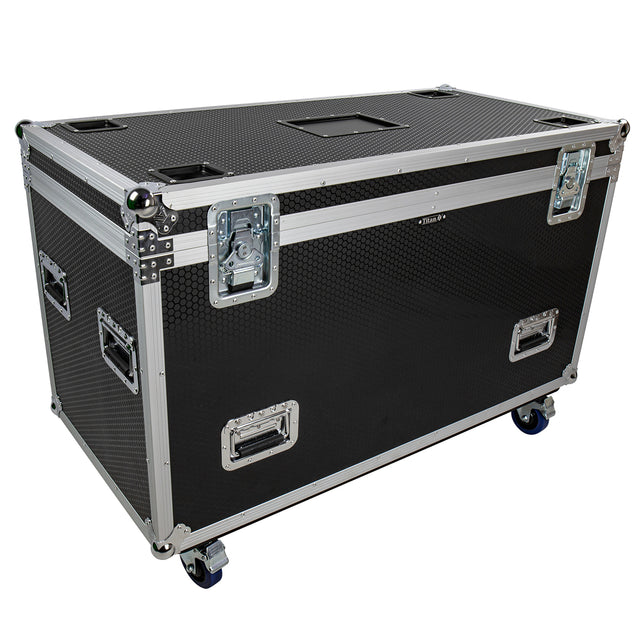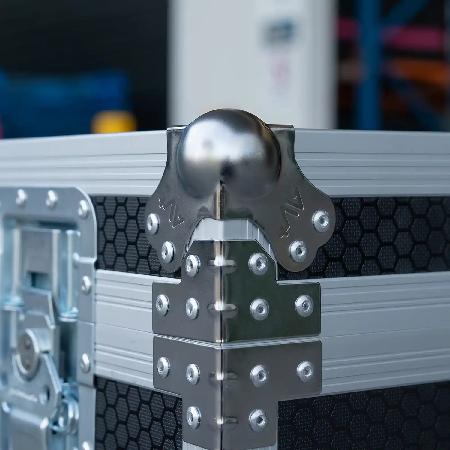 Stacking 4 wide and 3 high in a standard box truck, this case is ideal for production companies needing efficient use of space without compromising protection. Constructed from 9mm Hexa plywood and outfitted with 4" blue rubber Hi-Tech Performa castor wheels, this case is built tough to meet the demands of AV professionals. The shallow castor cups and stackable design ensure safe and easy transport for any touring act.